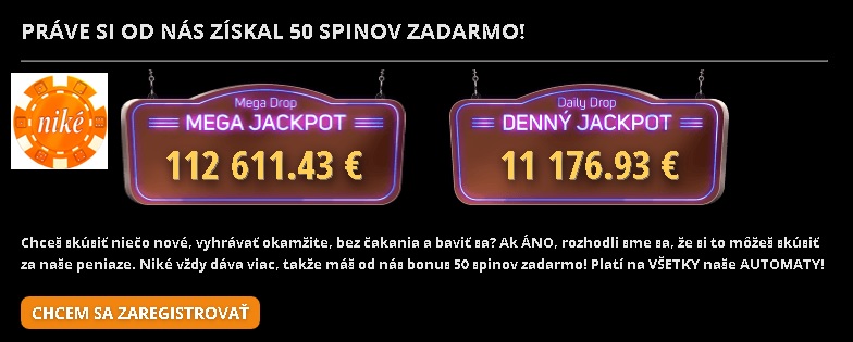 Iba Nike najlepšie slovenské online kasíno ponúka bonus pre všetkých nových hráčov 50 voľných otočov, ktoré su ponúkané bez akýchkoľvek podmienok. Jediná podmienka je REGISTRÁCIA, ktorou splníte všetky požiadavky v Nike a môžete si vybrať svojich 50 voľných otočov. Nie je to málo, takže určite Vám to niečo donesie a urobí deň krajším.