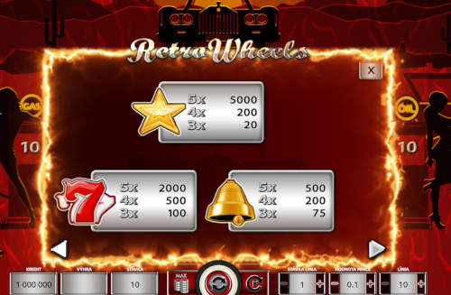 Návrat do retro štýlu online automatu Vám ponúka Retro wheels. Inak forma automatu je 5 valcová so 4 radmi. Je tu možnosť zvýšiť výherné línie svojou stávku z 10 na 15. Benefity ako scatter symbol HVIEZDA a divoký symbol ŽOLÍK robia hru oveľa zaujímavejšou. Divoký symbol a zobrazuje iba na strednom valci a nahrádza každý iný symbol na výherný okrem hviezdy. Ak dostane minimálne 3 scatter symboly HVIEZDA, tak automaticky dostávate scatter výhru. Výherné línie sú zobrazené v obrázku: